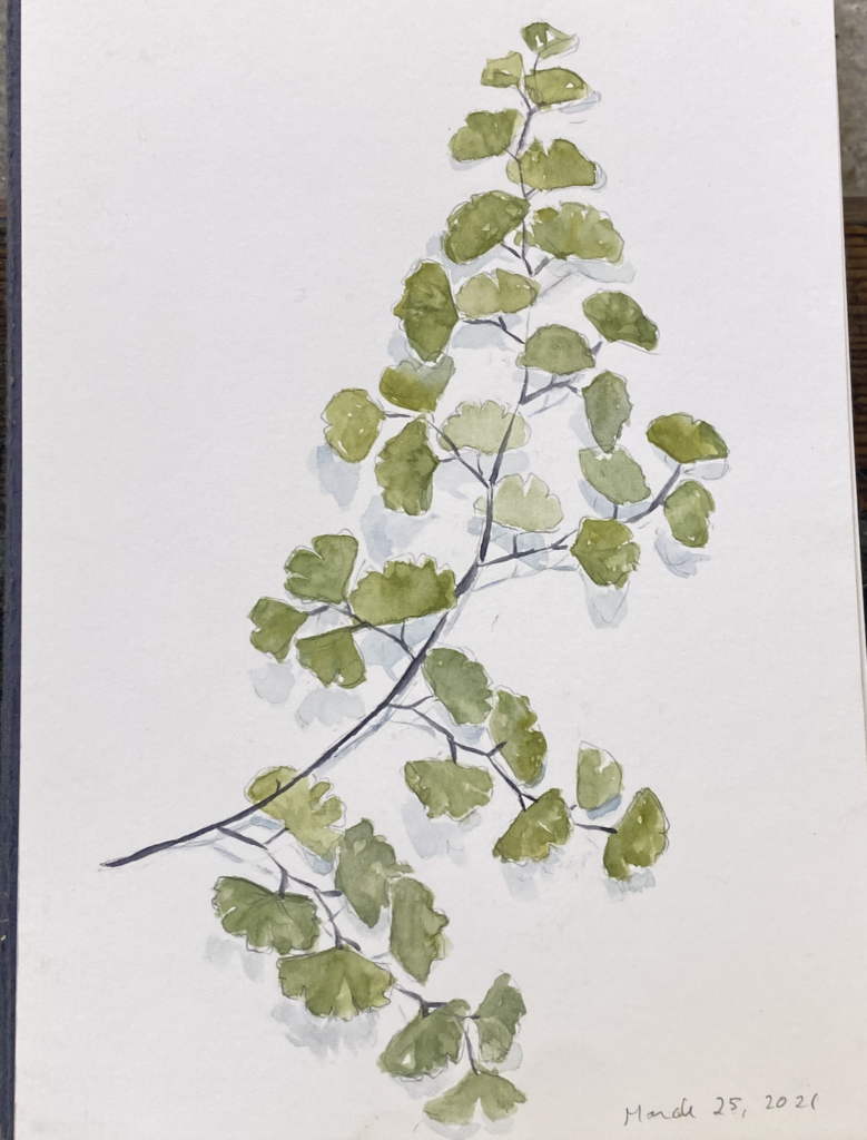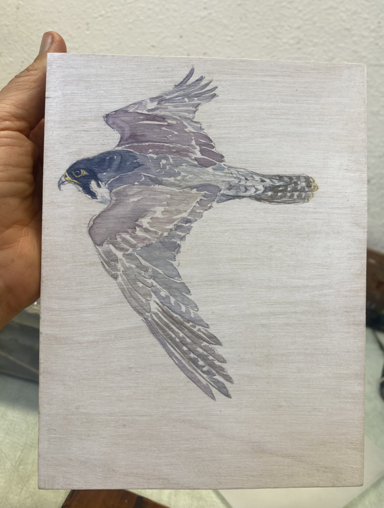 Left: Maidenhair fern. Right: Peregrine falcon on wood. Stephanie uses watercolors such as these as reference for her etchings.