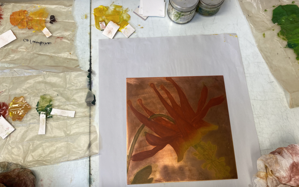 Few things give me more pleasure than observing a plant or bird in the wild and sketching it. That deep attention yields so much. Time slows, and I get lost in wonder. If you sit awhile the plants will move! You can see the tepals unfurl and anthers dehisce if you stare at a leopard lily long enough. When I portray a bird, whether it is a songbird or a diving falcon, I need to imbue it with life. I’m not entirely sure what animates a piece–partly it’s about getting the eyes right–but I know when I have succeeded. (Or failed: not all etchings cross the finish line.)