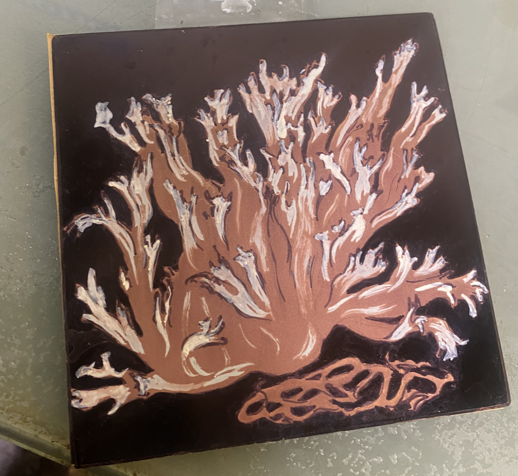 Left: Scribed metal plate. Middle: aquatint to create areas of tone on the metal plate. Right: inked plate, ready to be printed.