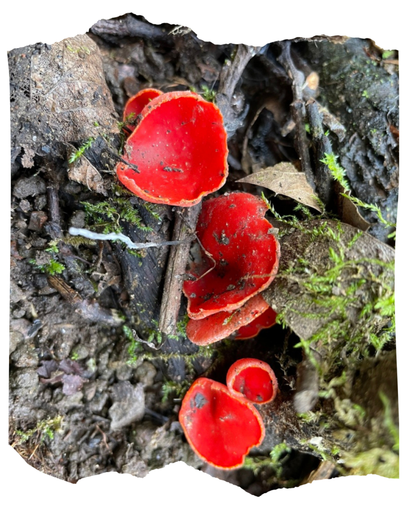 Near the end of the mushroom season—typically emerging in the late wintertime and spring—you might notice scarlet elf cups (Sarcoscypha coccinea) dotting Point Reyes’ forests. Their vibrant red-orange surfaces stand out on the forest floor, and are often initially mistaken for plastic litter or flowers. They grow on decaying hardwood (such as sticks, branches, and stumps), sometimes appearing to emerge right out of the ground if the wood is hidden beneath fallen leaves. As saprobes (the group of fungi that act as decomposers), these mushrooms help to provide nutrients for springtime flora to flourish.