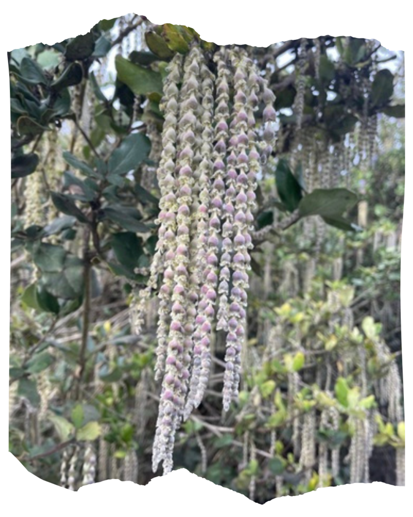 Although we’re in the midst of winter, signs of spring are already emerging! In January and February, long strings of grey-green blooms form on the coast silktassel (Garrya elliptica) decorating these trees like Mardi Gras beads, bearing a resemblance to the Bead Tree at Tulane University. These long clusters of flowers are called catkins; unlike other flowers, which contain both female and male structures, catkins are unisexual. On the coast silktassel, male catkins are longer (about a foot long) and appear grey-green, while female catkins are shorter with a silver-grey coloration. Pollen from the male catkins is released into the wind, landing on the smaller female flowers and prompting them to develop and release seeds.