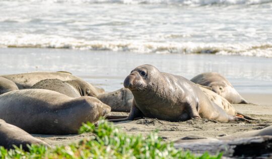 A young elephant seal lying on a sandy beach looking at the camera, with rocks and the ocean in the background. Text reads "Support conservation, education, and community-building!" A button reads "Click here to make a gift today" and "Help us reach our $450,000 goal by December 31st!"